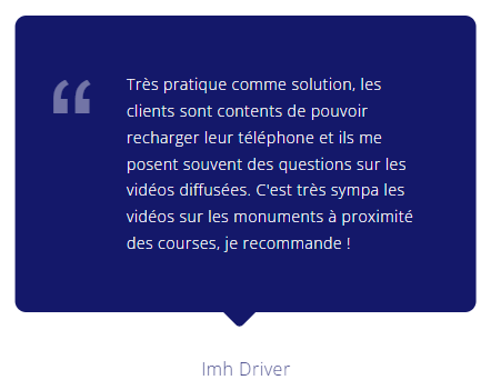En installant le média Digicab à bord de son véhicule professionnel, un chauffeur perçoit une rémunération mensuelle pouvant aller jusqu’à 200€, selon son niveau d’activité. Ce revenu complémentaire permet notamment aux chauffeurs de compenser l’augmentation du prix du carburant. Le Digicab, tablette média installée face aux voyageurs à l’arrière, diffuse du contenu vidéo personnalisé. Ainsi, il accompagne et divertit les passagers tout le long de leur course. Plus encore, le média dispose de câbles de rechargement de smartphones, utilisés par une grande majorité de passagers (79%).